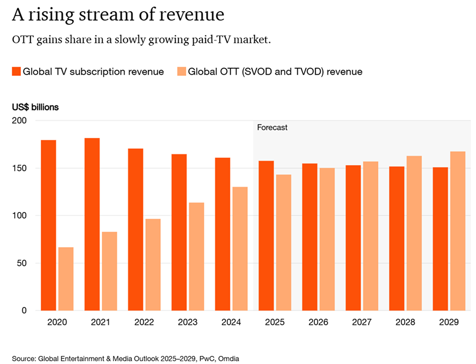2020年時,全球電視訂閱收入仍明顯高於OTT,但隨著消費者觀影行為快速轉向串流,兩者差距逐年縮小。在2024年之後,OTT收入的成長速度加快,PwC預測,到2029年,全球OTT市場規模將逼近170億美元以上,高於相對停滯的付費電視收入。