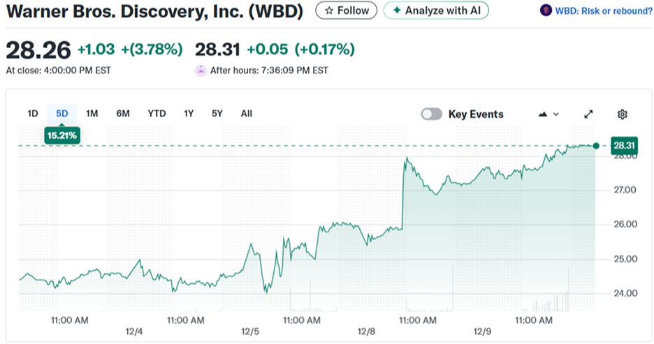 圖說:併購消息持續發酵,市場對華納兄弟探索後續談判與潛在溢價收購可能性抱持樂觀,股價順勢走強。