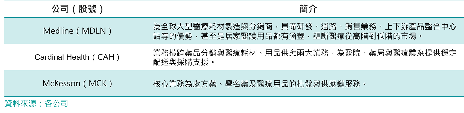 與上述醫材製造商不同,在美國醫療體系中,Medline(MDLN)、McKesson(CAH)與Cardinal Health(MCK)同屬於醫療供應鏈的關鍵企業,共同扮演連結製造端與醫療機構的重要後端角色。