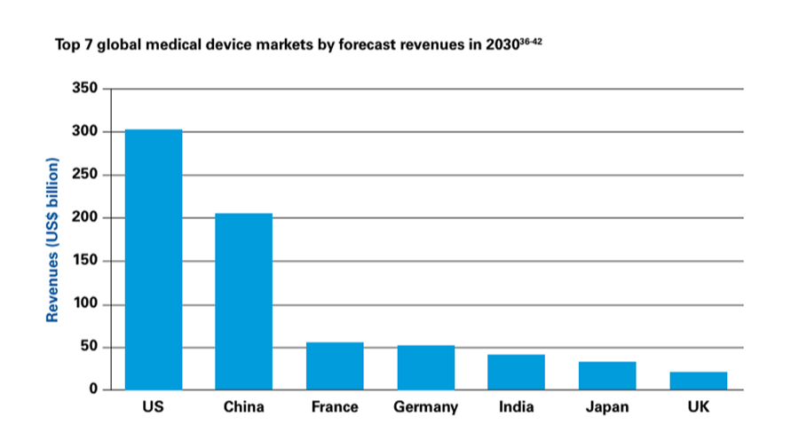 就區域結構統計,美國仍是全球最大單一醫療器材市場,預估至2030年市場規模將超過3,000億美元,占全球比重約四成。然而,相較於成熟市場的穩定成長,新興市場正展現出更快的擴張速度。中國預計將以逾2,000億美元的市場規模成為全球第二大醫材市場,占整體市場比重顯著提升;印度則在需求快速釋放與政策支持下,醫材市場規模有望超過400億美元,躍居全球前五大市場之一。