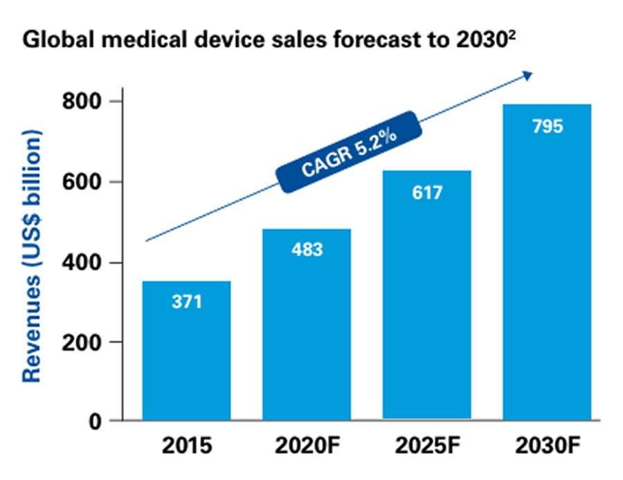 從宏觀的角度來看,Medline的成功建立在全球醫療器材產業長期擴張的結構性背景之上。根據市場研究機構統計,全球醫療器材市場規模從2015年約3,710億美元,預期至2030年可望突破 7,000億美元,整體年複合成長率約落在5%左右。