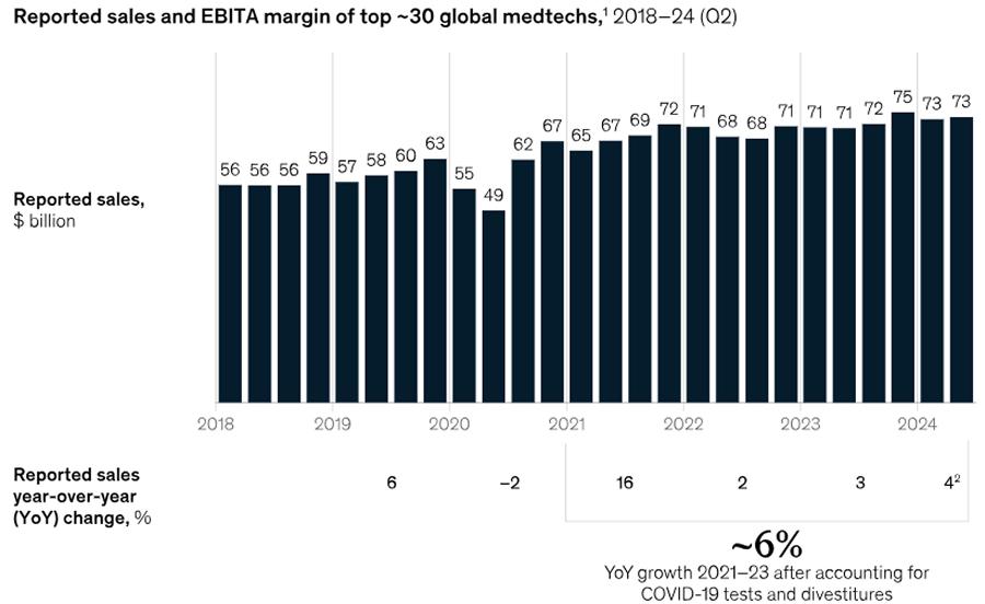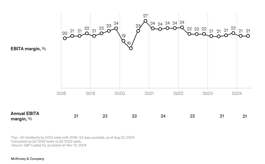 相關研究顯示,自2021年以來,以醫療器材為核心美國大型醫療科技公司在價值創造上的表現明顯落後大盤,產業營收雖仍維持成長,但速度已顯著放慢,同時利潤率亦未能回到疫情前水準。