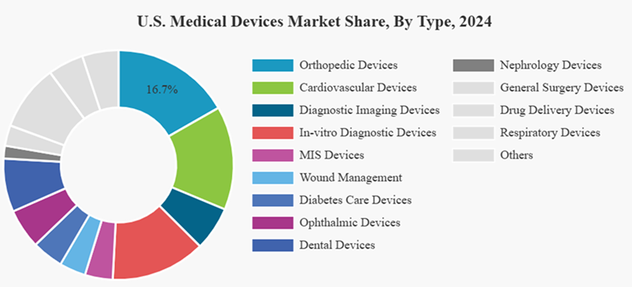 進一步聚焦美國市場,其醫療器材需求結構呈現高度多元化。以產品類型區分,骨科相關器材仍為最大單一類別,占整體市場約 16.7%,主要受惠於高齡化人口帶動的關節置換與脊椎手術需求。