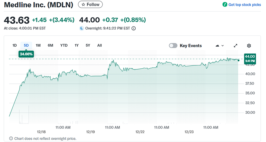 圖說:Medline上市後股價走高,短期內累積漲幅顯著,資本市場對該公司的關注度高。