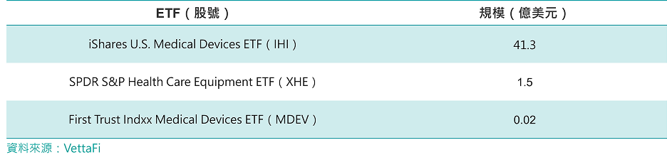 目前美股主要醫療器材ETF有iShares U.S. Medical Devices ETF(IHI)、SPDR S&P Health Care Equipment ETF(XHE)、First Trust Indxx Medical Devices ETF(MDEV)等,其成分股多以醫療設備與器材製造商為主。