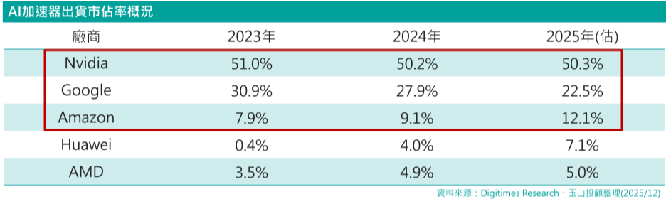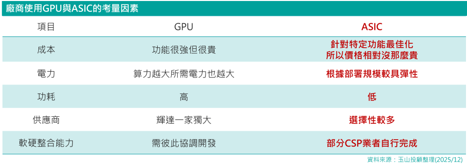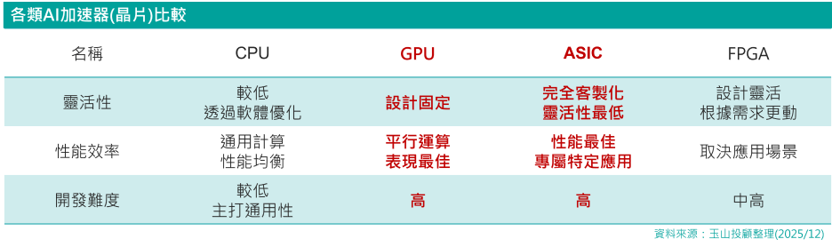 AI加速器為專為人工智慧所設計之晶片,簡稱AI晶片,涵蓋了圖形處理器(GPU)、現場可程式化邏輯陣列(FPGA)、神經處理器(NPU)、張量處理器(TPU)、特殊應用積體電路(ASIC)等各種晶片。以整個AI產業的發展方向來看,AI運算的兩大重點為訓練與推論,訓練端著重於將大規模數據進行反覆運算,算力越強可縮短訓練時間並達到模型最佳化,此時GPU佔據絕對優勢,但訓練模型已達一定基礎或能力時,需要開始側重推理能力進而針對市場需求導入各類應用,目前更多廠商開始走到這個階段,所以特定用途之ASIC晶片開始受到廠商青睞。玉山投顧預期2026年開始,AI加速器將從GPU獨大,漸漸走向GPU與ASIC雙主流。