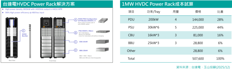 第2個值得留意的產業是Power Rack。輝達Rubin Ultra NVL576預計功耗達到600kW,傳統的54V機架內配電專為KW-scale機架設計,傳統架構面臨物理極限,對此,HVDC Power Rack為48/54V資料中心走向800V資料中心的過度解決方案,也預計在Rubin世代登場。目前,HVDC Power Rack仍在POC階段,根據台達電(2308)的樣機以及供應鏈調查,1MW Power Rack成本遠超原先18萬美元預估達到50萬美元,推測將於2026下半年出貨,主要客戶為Meta、Google。