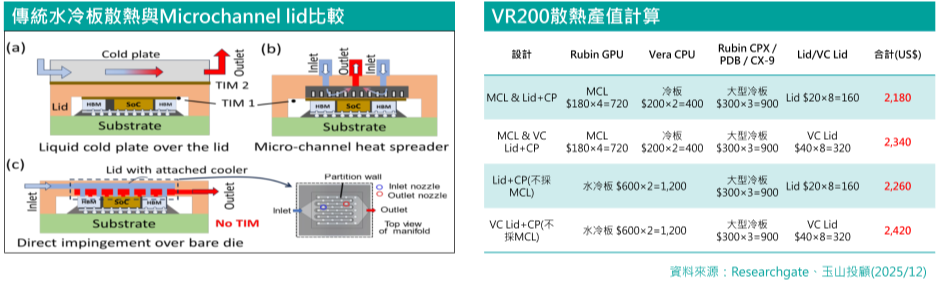 第3個重要的產業趨勢是MCL。因應AI晶片功耗提升,散熱廠正積極推進MCL及MCCP,MCL必須採用半導體等級的製程,面臨較多生產疑慮,後續是否採用靜待最終測試結果,MCCP為奇鋐(3017)與輝達研發,有望較快導入。玉山投顧預期CPX在4×Rubin GPU+2×Vera CPU之外,將新增8×Rubin CPX,水冷覆蓋範圍擴大為整個Compute tray,因採用GPU更多及散熱方案升級,Compute tray內含價值將提升70%~80%。