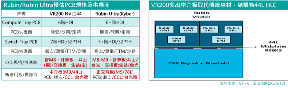 在材料端,隨著AI晶片對於運算速度的激素提升,PCB也迎接升級浪潮。以輝達VR200 NVL144架構來看,Compute Tray將沿用GB系列的Bianca模板,其中HDI從5階升級至6階,材料上,CCL仍為M8等級,目前唯一過驗證供應商為斗山,銅箔則自HVLP3升級至HVLP4。NVL Switch Tray則預計將從HDI 5階升級至7階,並採用M8材料,預計主要供應商為生益。並多出中介板(midplane)取代傳統線材,結構為44L HLC,材料將使用M9,預計台光電(2383)將為主供。