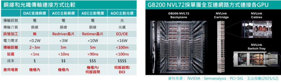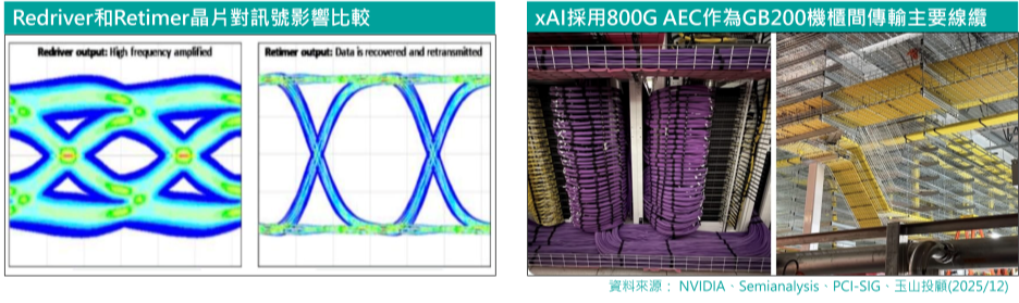 AEC主動電纜兩端內含Retimer/DSP晶片,可將訊號重新調節、消除雜音以及放大訊號,提升清晰程度,由於單價較高,目前主要應用於ASIC伺服器。隨Retimer和DSP晶片頻寬增加,可減少銅纜使用量,更易於凹折,同時增加線纜長度,可應用於機櫃間長距離傳輸。xAI大型資料中心「Colossus II」採用800G AEC主動電纜作為GB200伺服器機櫃間傳輸主要線纜,為AEC首次應用於GB200機櫃,顯示AEC從過往Tray-to-Tray傳輸應用場景拓展至Rack-to-Rack。