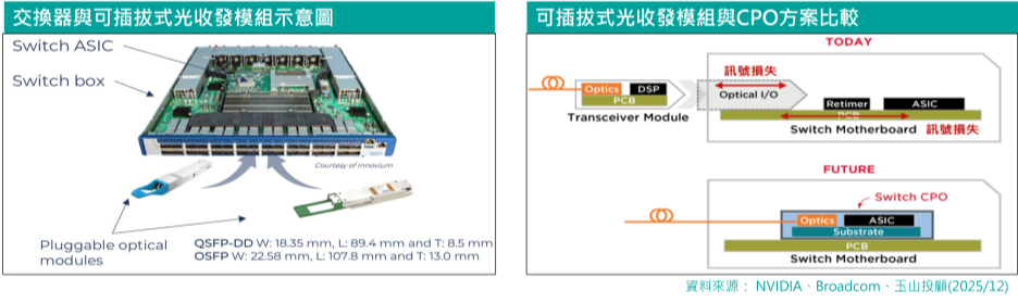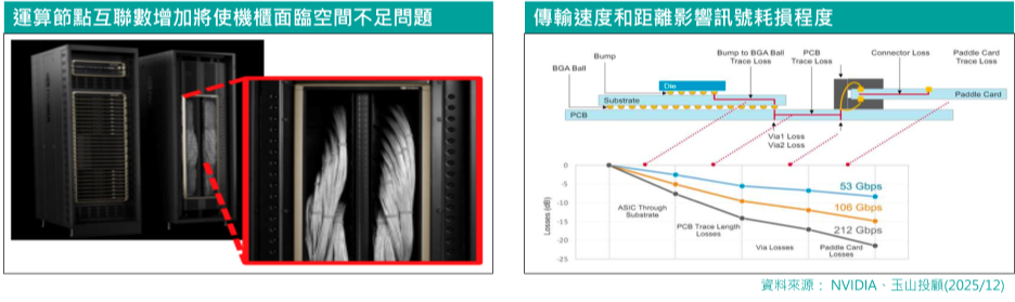 目前,輝達GB200 NVL72搭載5,184條DAC直連銅纜和ACC主動銅線串連GPU和Switch等運算節點,隨互聯數增加,將使機櫃空間不足,影響「散熱」與「傳輸效率」,因此長線來看,光纖將較銅線具備優勢,因(1)光子速度較電子快;(2)不受電磁干擾(EMI);(3)能量和訊號損耗較少,更適合中長距離和高速傳輸,玉山投顧預期未來核心運算單元傳輸速率達3.2T以上時,將面臨「散熱」、「功耗」、「訊號傳輸效率」及「運算密度」等問題,故共同封裝光學模組架構(CPO)成為解決「摩爾定律瓶頸」的關鍵技術。
