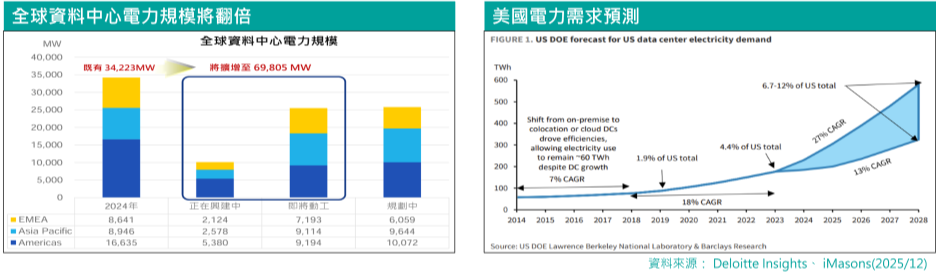 除了AI伺服器帶來的各項升級商機,缺電問題也是發展AI的重大待解問題。根據研調機構資料顯示,2024年全球資料中心電力規模達34,223MW,預期電力規模將在2028年翻倍,自2023年起,美國資料中心電力需求至少每年增加13%,至2028年至少達325TWh,占美國總電力需求的7%。雖然太陽能和風能的發電容量於拜登政府時期快速成長,仍落後於需求成長,電力短缺可能在2030年代初期出現,而資料中心建置密集的特定區域的缺電將發生得更早。