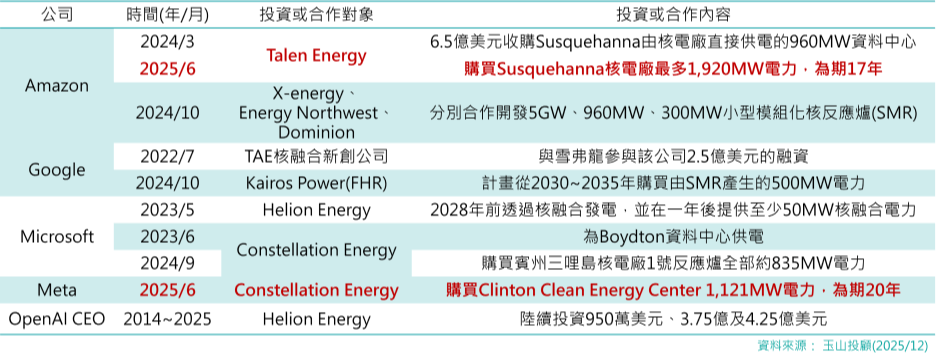 目前,科技巨頭陸續預定未來核電供應,確保現有及未來資料中心供電無虞。另外不少業者亦投資新型核電技術如核融合、小型模組化核反應爐(SMR)等,不完全依賴第三方供電,核電長期趨勢已經成型。且值得留意的是,川普於2025年5月24日簽署四項行政命令打算重振核能產業,包含重振核產業基礎、改革能源部核反應爐測試程序、部署先進核反應爐技術用於國家安全和改革核監管委員會等命令,目標美國核電容量在2050年前翻四倍,達400GW,國家政策也予以支持。