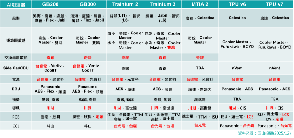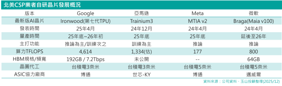 目前,北美4大CSP業者+甲骨文今年資本支出將成長61%至3,851億美元,2026年則再成長18%至4,539億美元,這些CSP業者雖然主力採購產品還是輝達的AI晶片,但其實也持續發展ASIC晶片,除了剛剛提到的不想過度依賴輝達,搭配搭配自身需求推出最適ASUC晶片及下游應用也符合商業利益,目前玉山投顧參考算力、量產時間、供應鏈訊息,看好Google與亞馬遜ASIC晶片供應鏈量產最為順利。
