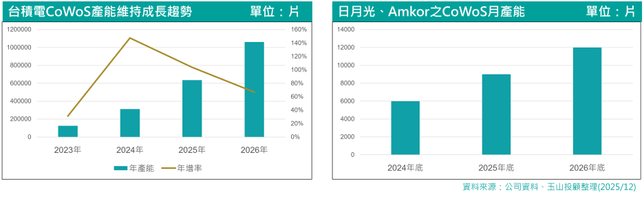 除此之外,在先進封裝方面,玉山投顧預估今、明年底台積電CoWoS月產能將分別達到7~7.5、10~10.5萬片,對應年產能約63.6、106.2萬片,年增幅分別來到約104%、67%。而在AI晶片需求強勁下帶來外溢效應下,玉山投顧也預期CoWoS-L、先進封裝等毛利率低於台積電平均的製程會部分外包,使日月光投控(3711)持續受惠oS訂單(估今年底外包比重約50%),此外明年也有望獲部分AWS Trainium 3 CoWoS-R訂單,台灣半導體產業將雨露均霑。