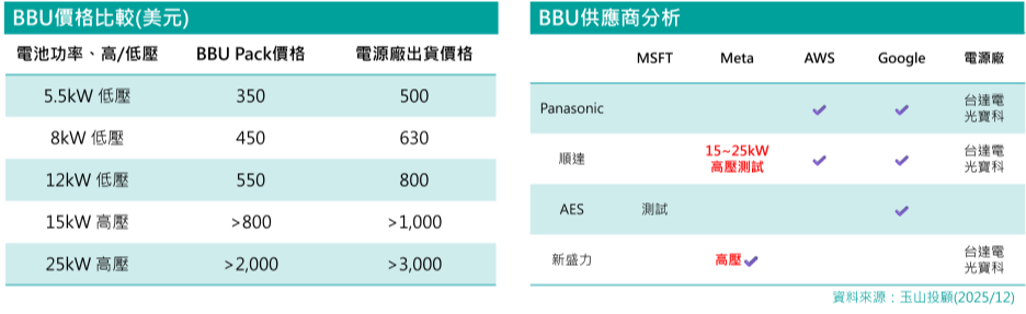 而在這些過去的零組件供應鏈中,玉山投顧也遴選出幾個市場關注的AI產業趨勢。第1個值得留意的是BBU供應鏈,在 OCP(Open Compute Project,開放運算計畫)架構中,BBU是資料中心電源設計的核心組件,主要用於取代傳統的大型 UPS(不斷電系統),直接在機架(Rack)層級提供備援電力,具有空間小、重量低、壽命長、效率高等優勢。目前台廠主要出貨BBU以5.5kW為主流,而電源廠商將整合BBU並加入電源管理系統後出貨BBU Shelf。根據玉山投顧調查,台廠中的順達(3211)已切入AWS、Google供應鏈(以低壓為主),Meta高壓專案則持續送樣中,新盛力(4931)日前與台達電(2308)積極送樣Meta高壓專案,根據供應鏈調查,新盛力已通過認證,成為台廠BBU黑馬。