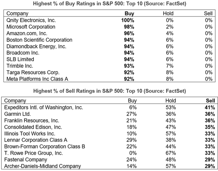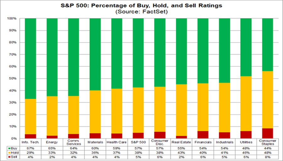 FactSet指出,目前針對S&P 500成分股共計有12,696筆評等。其中,57.5%為「買進(Buy)」評等、37.7%為「中立/持有(Hold)」評等,以及4.8%為「賣出(Sell)」評等。