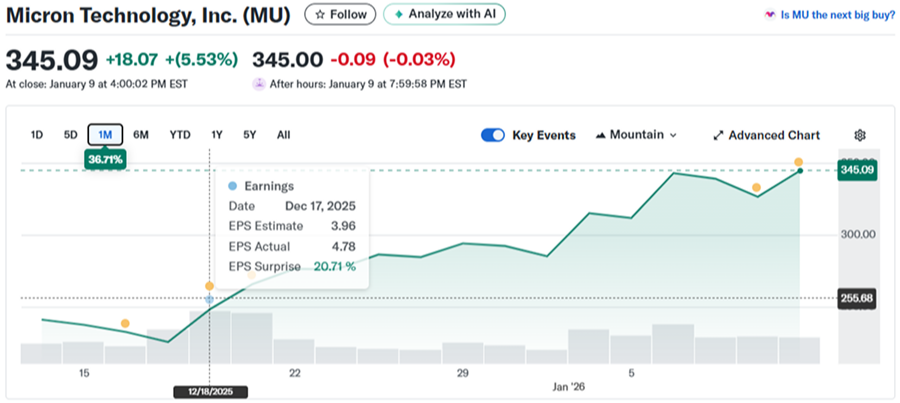 圖:美光在財報公布前,市場對個人電腦與智慧型手機需求復甦進度仍抱持觀望態度。然而,美光於2025年12月17日公布的季報顯示,其營收、獲利與毛利率皆大幅優於市場預期,帶動投資人對基本面的重新評估,股價延續偏多格局。