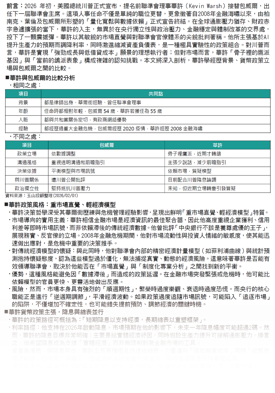 若你想要看完以上完整內容,進一步了解新任聯準會主席華許的背景,還有美國聯準會未來政策的變化將為美國利率乃至於經濟有什麼影響,請點擊下方「閱讀更多」,相關研究內容已整理於玉山投顧完整報告中。