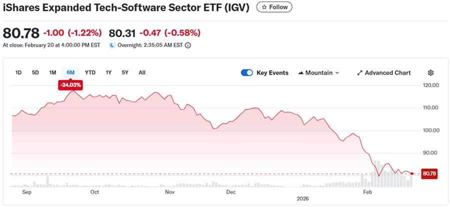 圖說:IGV是軟體產業的代表ETF,權重涵蓋大型SaaS與雲端應用公司。2月初快速下探,成交量明顯放大,恐慌性拋售潮不止,短線最低曾逼近80美元關卡。