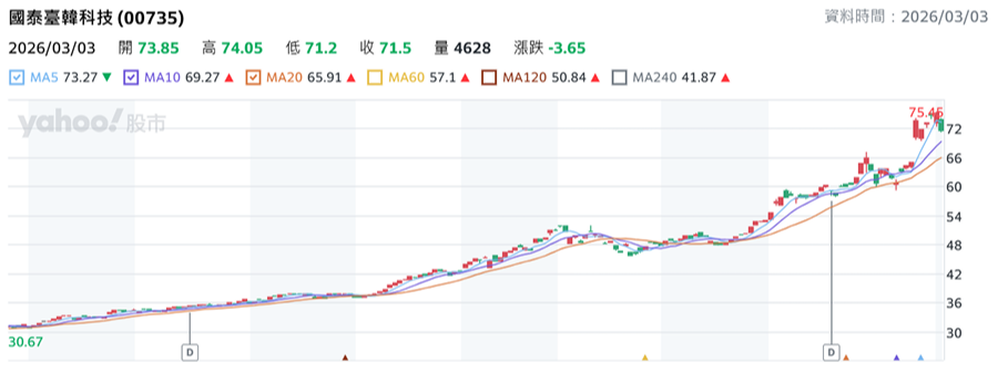 國泰臺韓科技(00735)近一年走勢明顯偏強,自約30元附近一路上行至目前70元以上水準,股價幾乎翻倍成長,過程中雖然偶有震盪整理,但整體重心持續墊高,反映市場對臺韓科技與半導體題材的高度關注與資金支持。