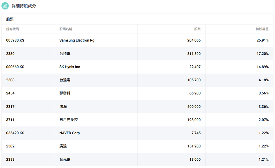 持股明顯集中在臺韓半導體與關鍵零組件龍頭,前幾大權重包含三星電子(約26.91%)、台積電(約17.20%)、SK海力士(約14.89%),再搭配台達電、聯發科、鴻海、日月光、NAVER、廣達、台光電等,整體以布局AI基礎建設供應鏈為主。