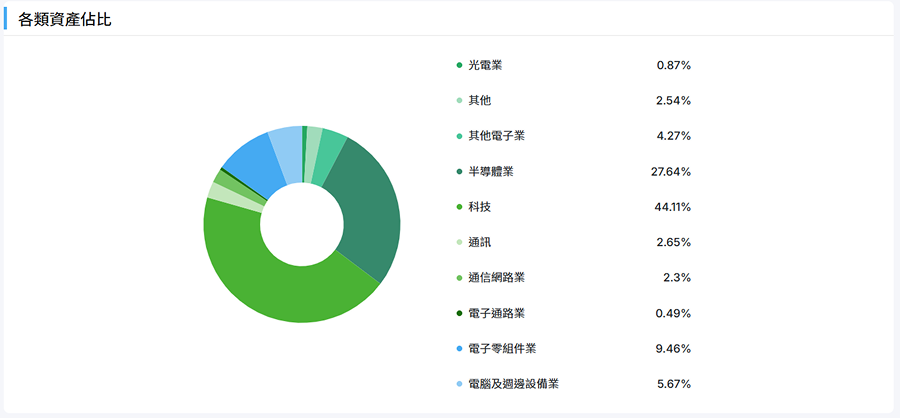 產業分布則以「科技」約44.11%與「半導體」約27.64%為主,並分散在電子零組件、電腦及週邊設備、通訊與網路等次產業。