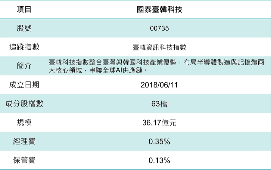 國泰臺韓科技(00735)以「臺韓資訊科技指數」為追蹤標的,2018/06/11成立、成分股約 63 檔,規模約36.17億元,費用結構為經理費0.35%、保管費 0.13%,屬於以科技供應鏈為核心的跨市場配置ETF。