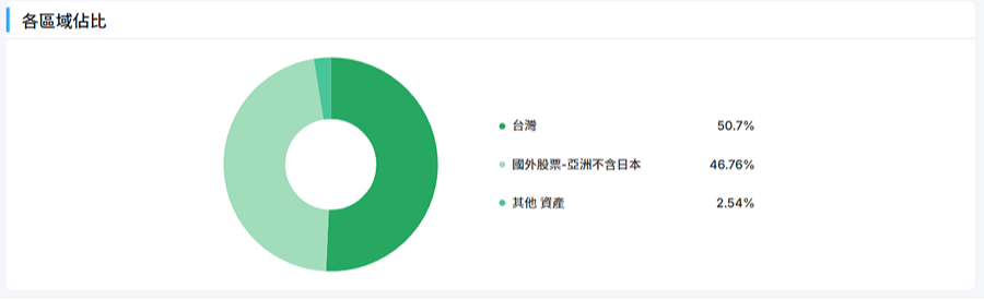 區域配置上,臺灣約50.7%,亞洲(不含日本)的海外股票約46.76%(主要對應韓國股票),其餘資產約2.54%,