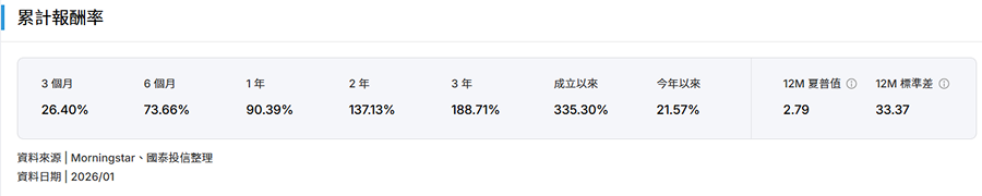 截至2026/01,近1年累計報酬約90.39%、成立以來約335.30%,但12M標準差約33.37,顯見其波動不低,屬於「高成長、高波動」的科技型配置。
