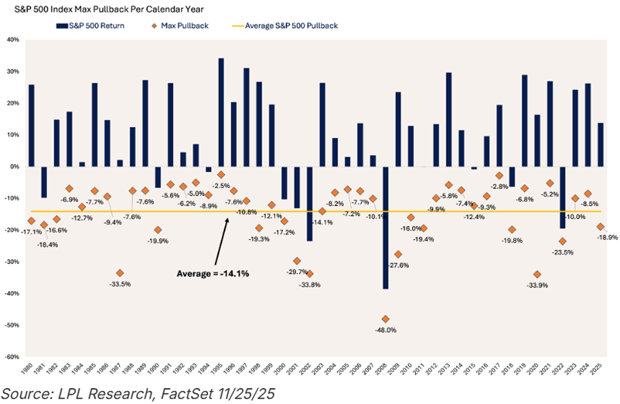 再以全年度的角度來看,根據LPL Research統計,S&P 500指數在過去數十年間,每年的平均最大下跌幅度約為14%。換句話說,即使在整體報酬為正的年份,市場中途出現10%以上的修正其實相當常見。