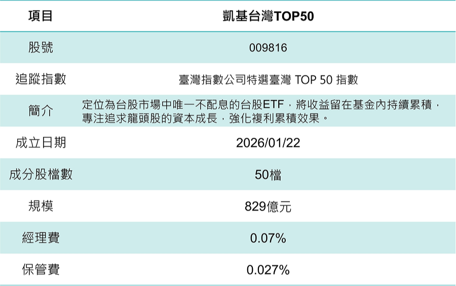 近年台股ETF市場愈來愈熱鬧愈來愈多產品從單純追蹤大盤走向策略設計。凱基台灣TOP50(009816)就是其中一檔備受關注的代表,上市不到一年規模飆升至800億元以上,躋身台股ETF前段班。它主打不配息、訴求長期複利,也透過權重限制與動能加碼機制,試圖在大型權值股架構下追求不同於傳統市值型ETF的報酬表現。本文將從指數邏輯、產品特色、優缺點出發,帶你快速了解這檔ETF。