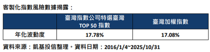 而這種差異,從波動數據上也看得出來。據統計,臺灣指數公司特選臺灣TOP50指數的年化波動度為17.78%,高於臺灣加權指數的17.08%。這代表客製化指數雖然可能追求更高報酬機會,但價格波動也相對更大一些。