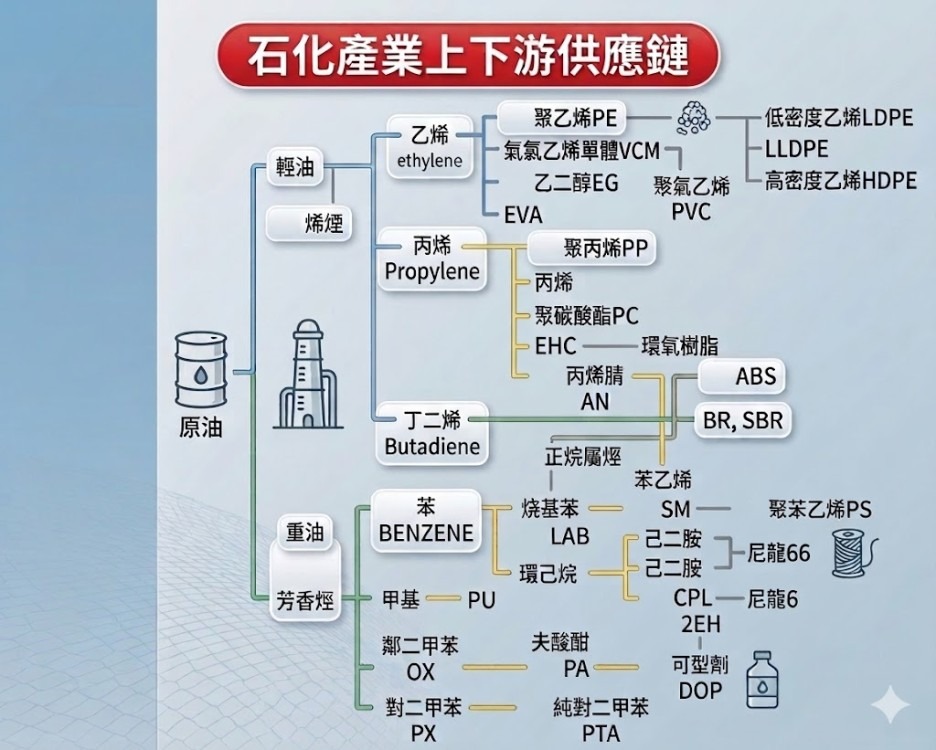 以整個產業結構來看,塑化產業上游的原料是原油,原油進場後加熱蒸餾,形成汽油、柴油、輕油,而輕質成分被提煉完後,則會剩下重油,重油一般則用於船用燃料,再加工則可以在轉化為柴油及輕油。而輕油其實就是整個塑化產業的最重要產品,可透過「裂解」產生烯烴,經「重組」製程產生芳香烴,並可形成乙烯、丙烯(烯烴)與苯、甲苯、二甲苯(芳香烴)等中間原料,而中間原料又可以再形成多種下游塑化產品。