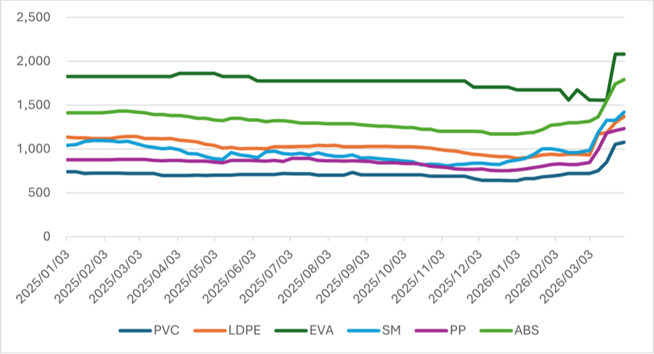 從台灣各塑化業者的獲利表現來看,2025年持續受到中國業者的大力競爭,致使相關業者的獲利表現普遍都陷入虧損。不過好消息是,近期因美伊戰爭導致油價大幅度的上漲,目前塑化下游產品的報價已經出現非常全面性的上漲,下游產品以PVC、PP、PS季漲幅都已經達到60%以上。而因為戰爭至今已經超過一個月,後續下游產品的漲價趨勢有機會延續。