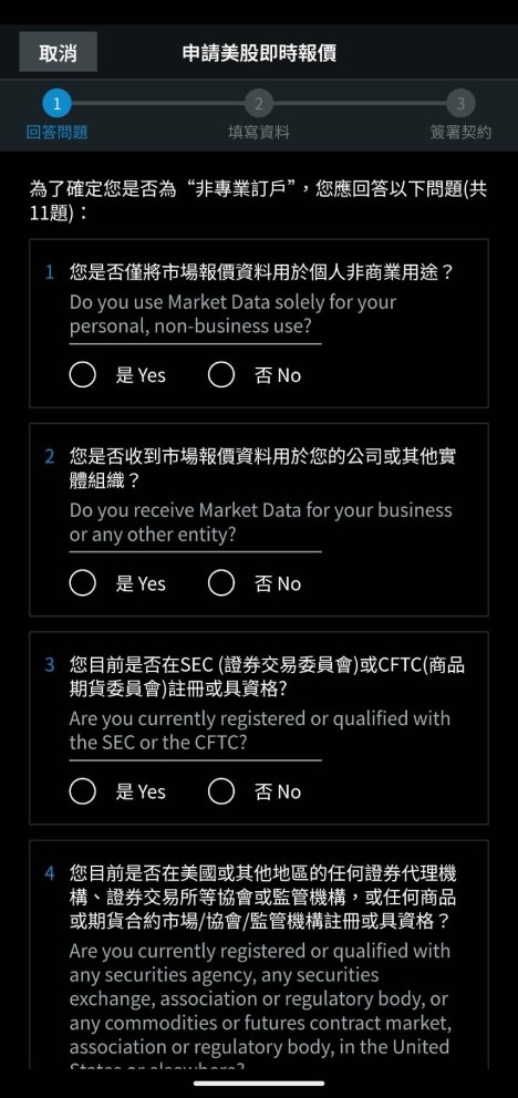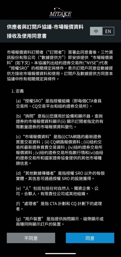 ▼[非專業用戶]2-2 閱讀「供應者與訂閱戶協議-市場報價資料接收與使用同意書」,選擇同意即可進入下一畫面。