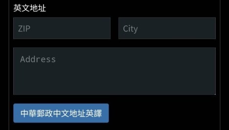 «ZIP同中文郵遞區號,填寫3碼或6碼皆可。City請填寫所在縣市,例如台北市為:Tapei City»