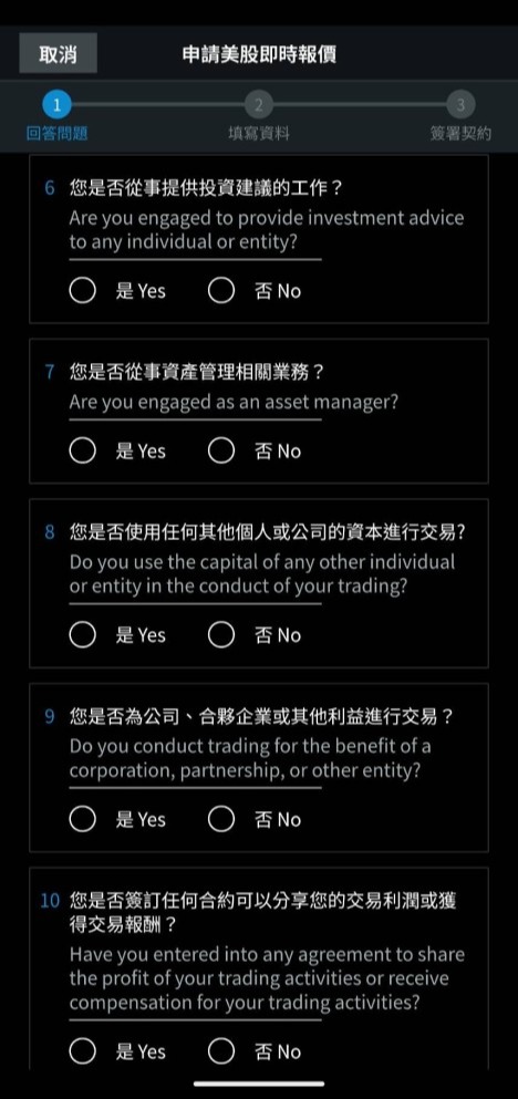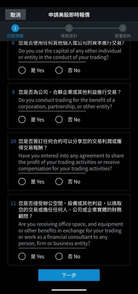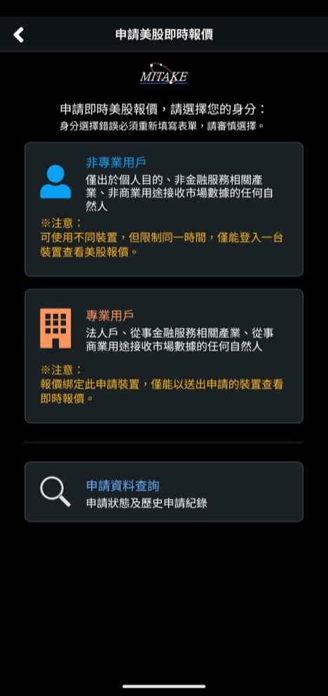 ▼[非專業用戶]2-3 依據自身狀況回答,若系統顯示「將視為專業用戶,請重新選擇身分」將無法進入下一畫面。