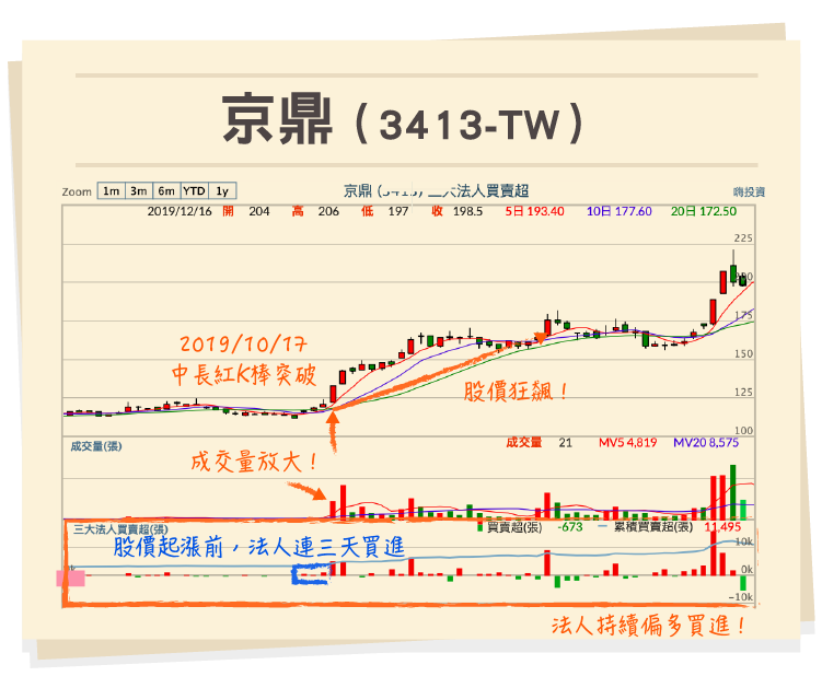 在2019/10/17,京鼎突然出現一根中長紅 K棒 的突破訊號,而且成交量還出現顯著放大的狀況,代表著當天很有可能是主力進場買進的訊號。我們在看一下前幾天的法人買賣超狀況,可以發現股價在起漲前三個交易日,出現了法人連續買超的狀況。法人看好後續表現,這時候股價又出現轉強突破的訊號,就會是一個很漂亮的進場點。